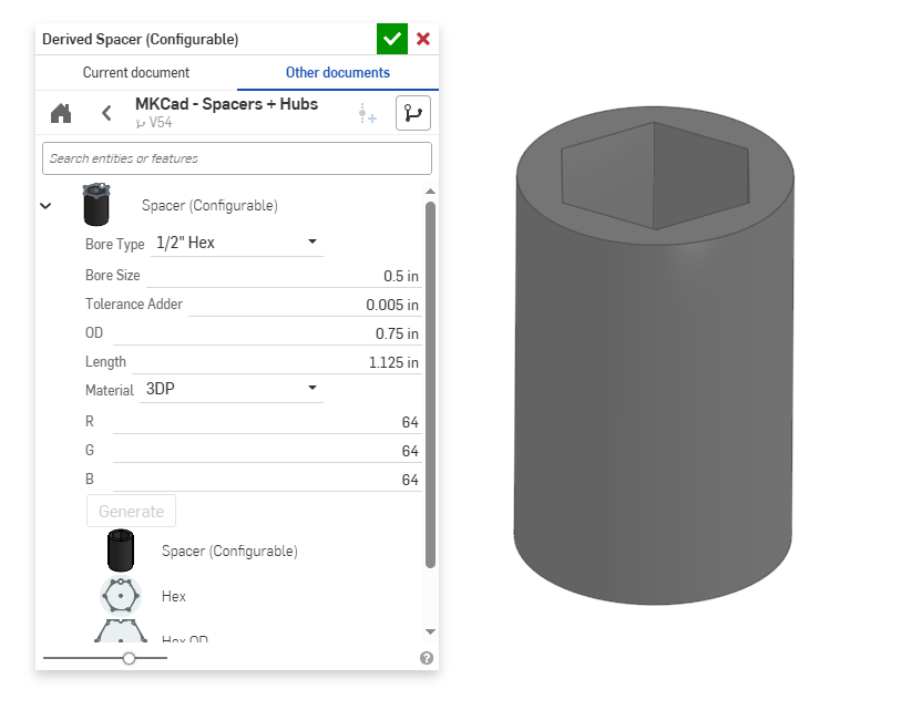 One of the most straightforward use cases for 3D printing in FRC is to make custom spacers for hex shafts. Using MKCAD you can quickly make a different types of spacers and customize the length. These are very easy to print at very low cost. You may notice in the dialogue box an option for additional tolerance (Tolerance Adder). 3D printers generally can produce very precise parts, but factors like thermal expansion, filament inconsistencies, poor calibration, and other error sources can lead to part dimensions that are either larger or smaller than intended. To address this we can add tolerance (gap between two parts) so that parts will fit together well. You likely will need to find the best tolerance your specific printer can achieve, but a reasonable starting tolerance will typically be about 0.004"-0.020" (0.1mm-0.5mm) depending on the type of fit desired (interference, close, clearance). Many online 3D print sites offer test prints to find the minimum tolerance of a given printer/filament combination.