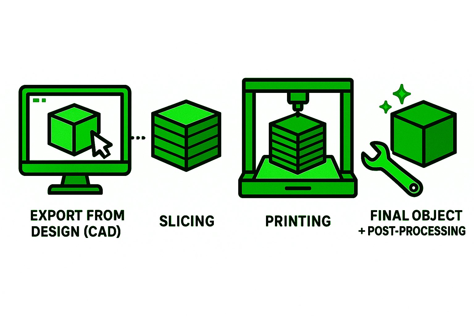 Export From Design (CAD) Once your design is created you need to process it through 3D printing software, so you’ll need to export it from your CAD software.