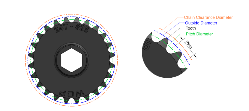 Below is an illustration of the pitch, pitch diameter, outside diameter, and chain clearance diameter of a sprocket.