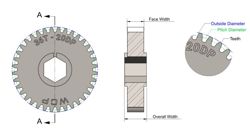 Illustration of a gear's pitch diameter and outer diameter. (Image source: WCP).