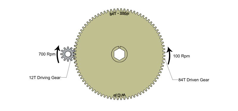 1. A 12T gear drives an 84T gear. The gear ratio is 84:12, which can be simplified to 7:1. The torque is increased by 7x while the speed is reduced to 1/7 of the original speed. (Image source: WCP)