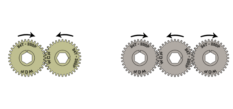 3. If the same size gears are used, there is no change in speed and torque. However, the direction of the rotation is flipped if there is an even number of gears from input to output. If there is an odd number of gears, the direction remains the same. (Image source: WCP)