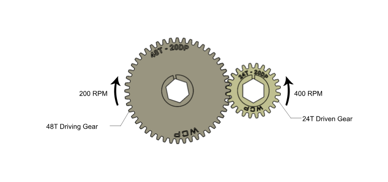 2. A 48T gear drives an 24T gear. The gear ratio is 24:48, which can be simplified to 1:2. The torque is reduced to 1/2 of the original torque while the speed is increased by 2x. (Image source: WCP)
