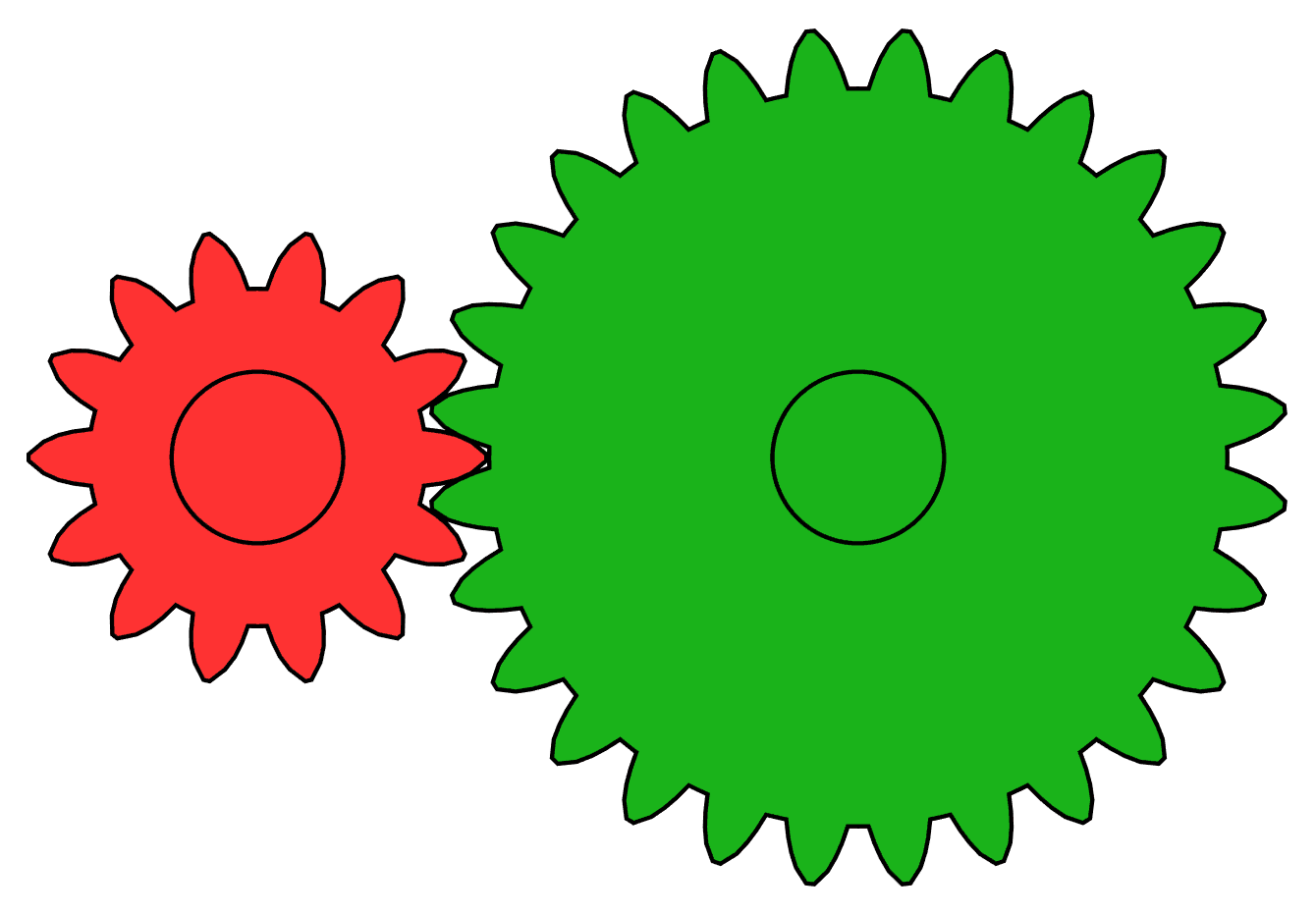 In order to change the torque and speed from the input to output, different sized gears must be used. Remember that the ratio is related to the number of teeth of the gears. Teeth will always mesh together one by one, but the number of teeth per revolution is different for different sized gears, causing a difference in angular speed even if the surface speed of the gear is the same. Click through the following slides to see a visualization of different gear ratios.